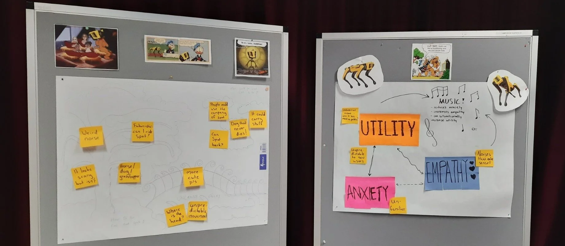 Data Analysis & Design Implications: Myriads of thoughts and suggestions on Post-its were converted into an Affinity Diagram and three main reactions of the users towards Spot were identified: Anxiety (unknowns), Utility (Spot is very useful!) and Empathy (dog-like features). These reactions led our team to the idea of incorporating sounds associated with various actions into Spot. We wanted to give Spot a voice! Inclusion of sound would make Spot less unpredictable and reduce user anxiety around it. Presence of a variety of sounds would also increase the empathy element towards Spot.