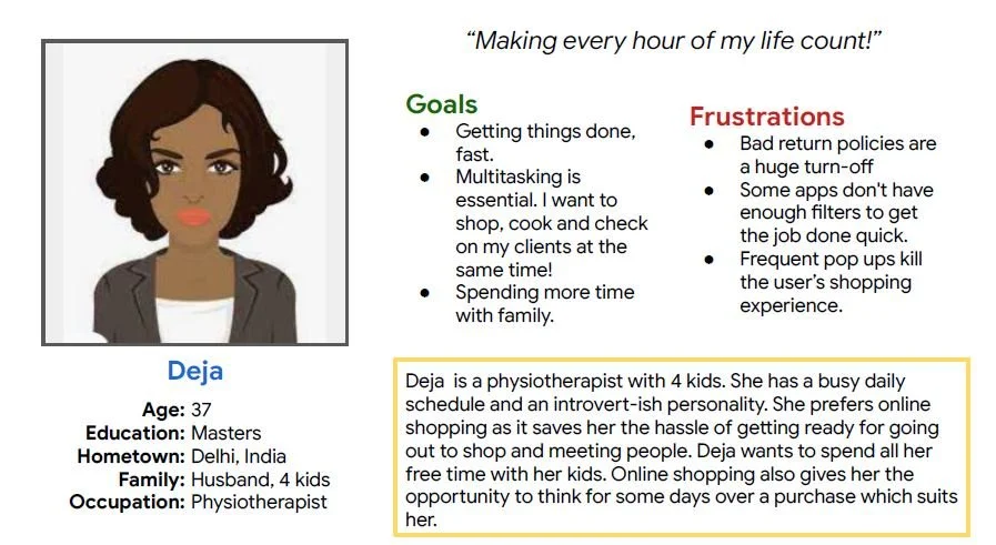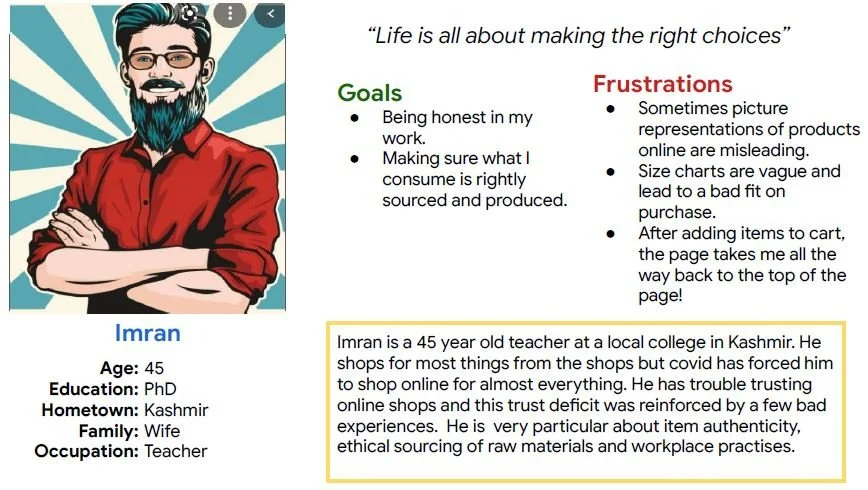 By analyzing the data from user interviews, I identified two distinct user groups and created two corresponding personas. One user group is concerned with ethical sourcing of hand-made products, other is an avid online shopper group, wanting maximum benefit from minimum time spent.
